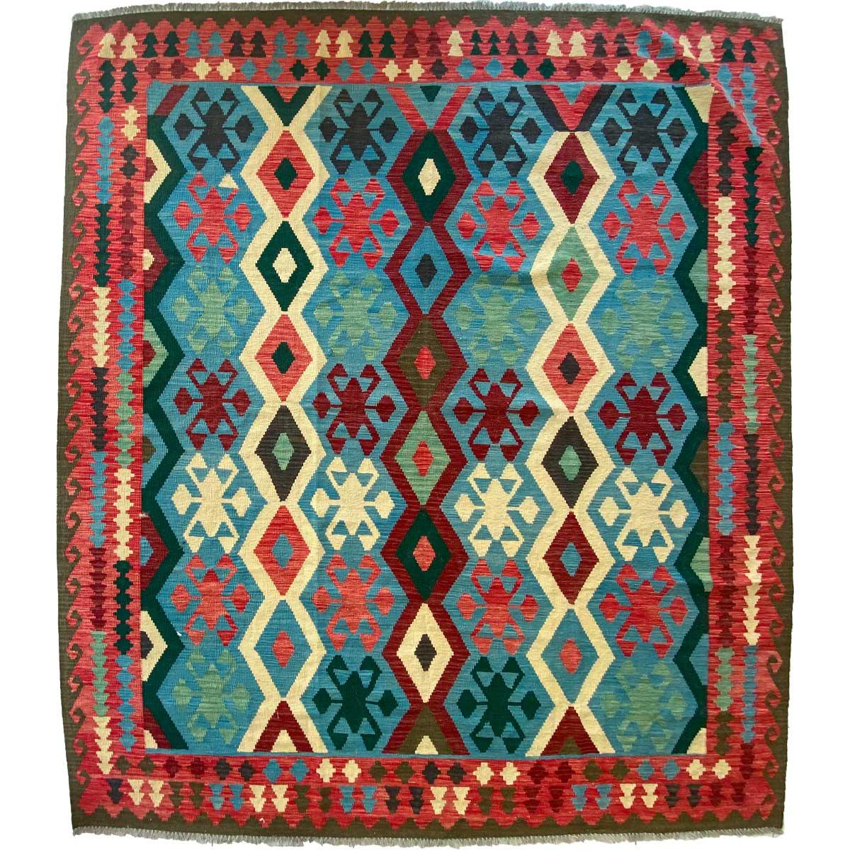 Handwoven by Afghan artisans, this vegetable-dyed kilim rug is a one-of-a-kind creation, never to be replicated. Its generous scale and tribal geometric patterns make it a versatile addition to any space. Woven with Ghazni wool, it ages into a soft, organic beauty, showcasing enduring craftsmanship that enhances any room.