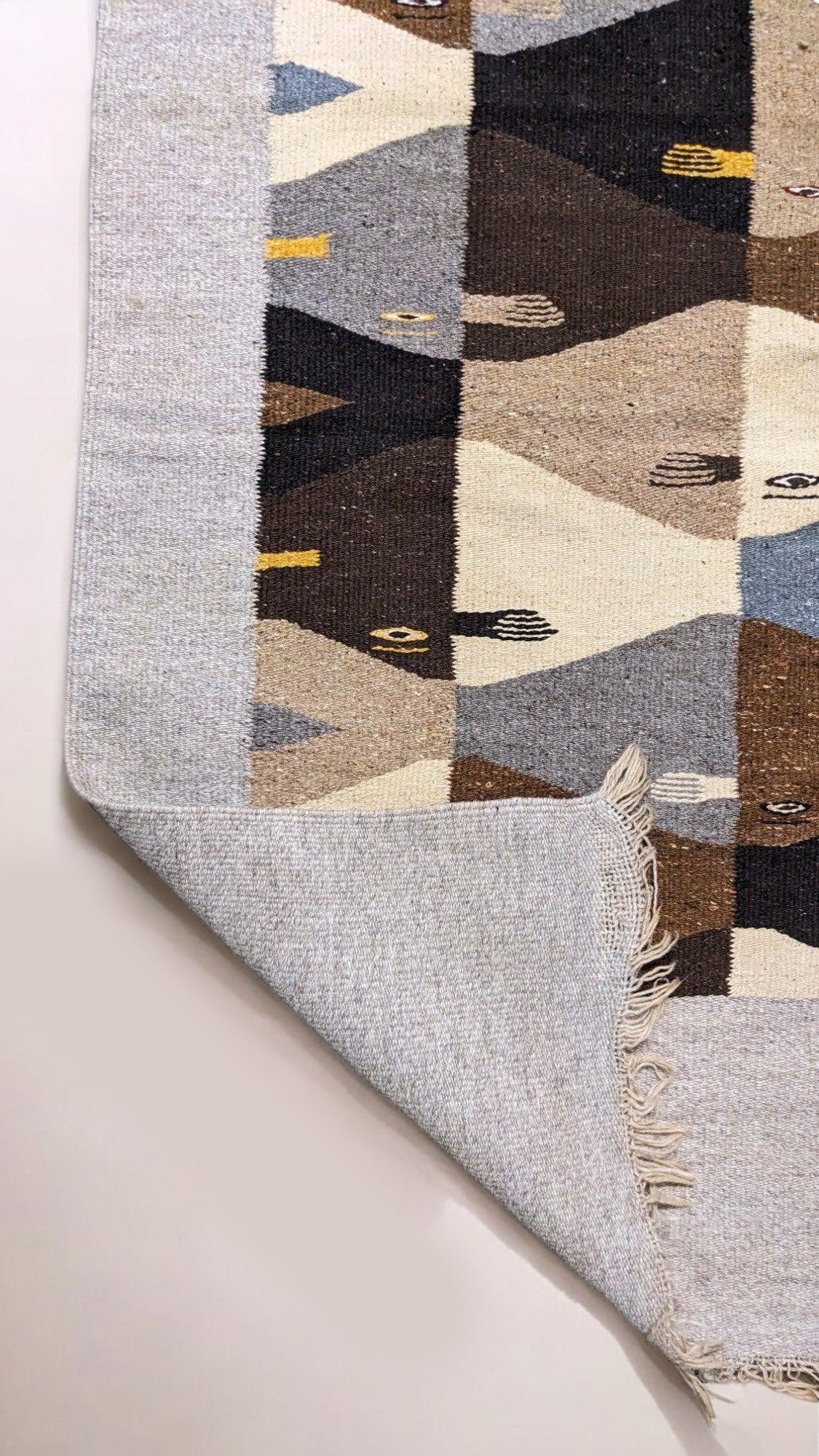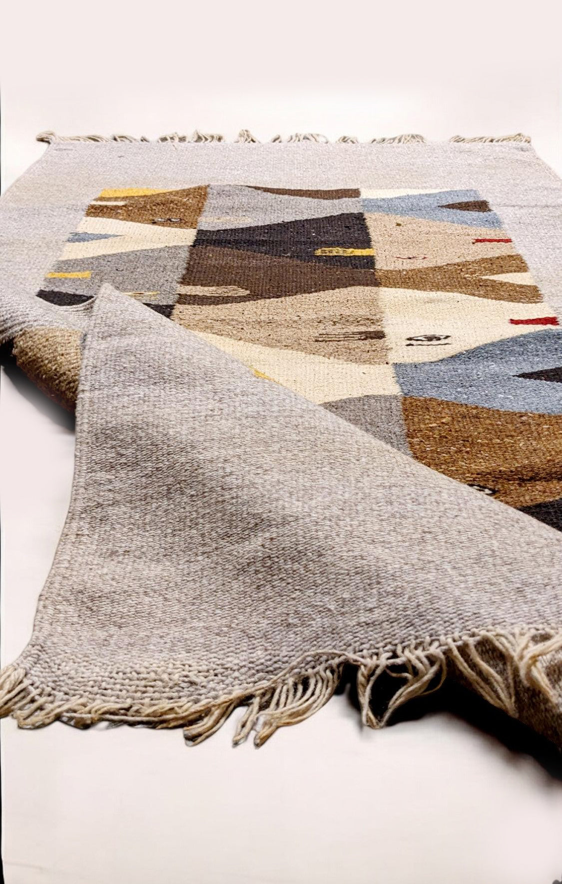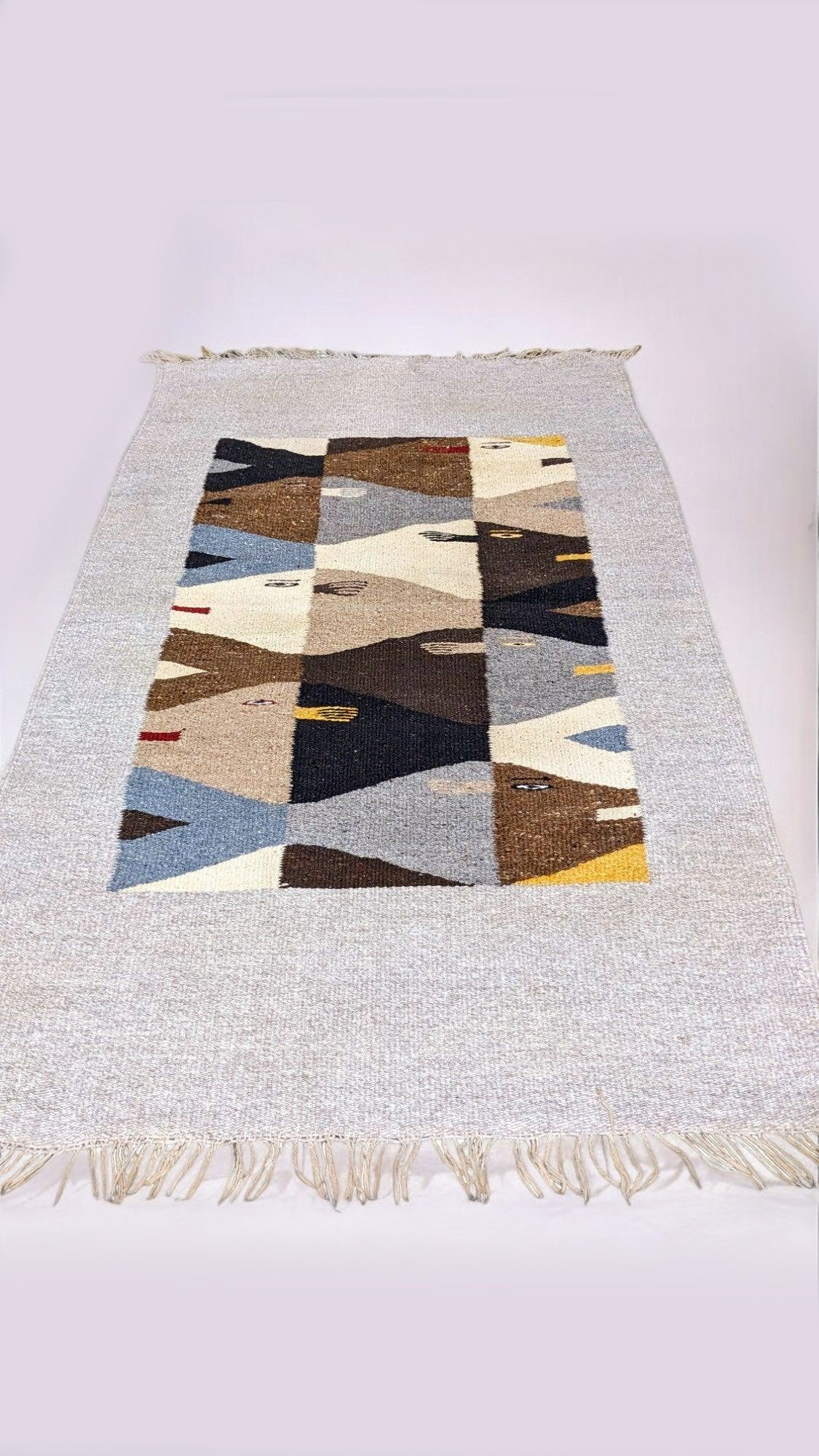 Dieser flachgewebte Teppich besticht durch sein modernes Design mit klassischem Kelim-Muster. Seine handwerkliche Qualität und Langlebigkeit machen ihn zu einer edlen und langlebigen Ergänzung für jeden modernen Raum.