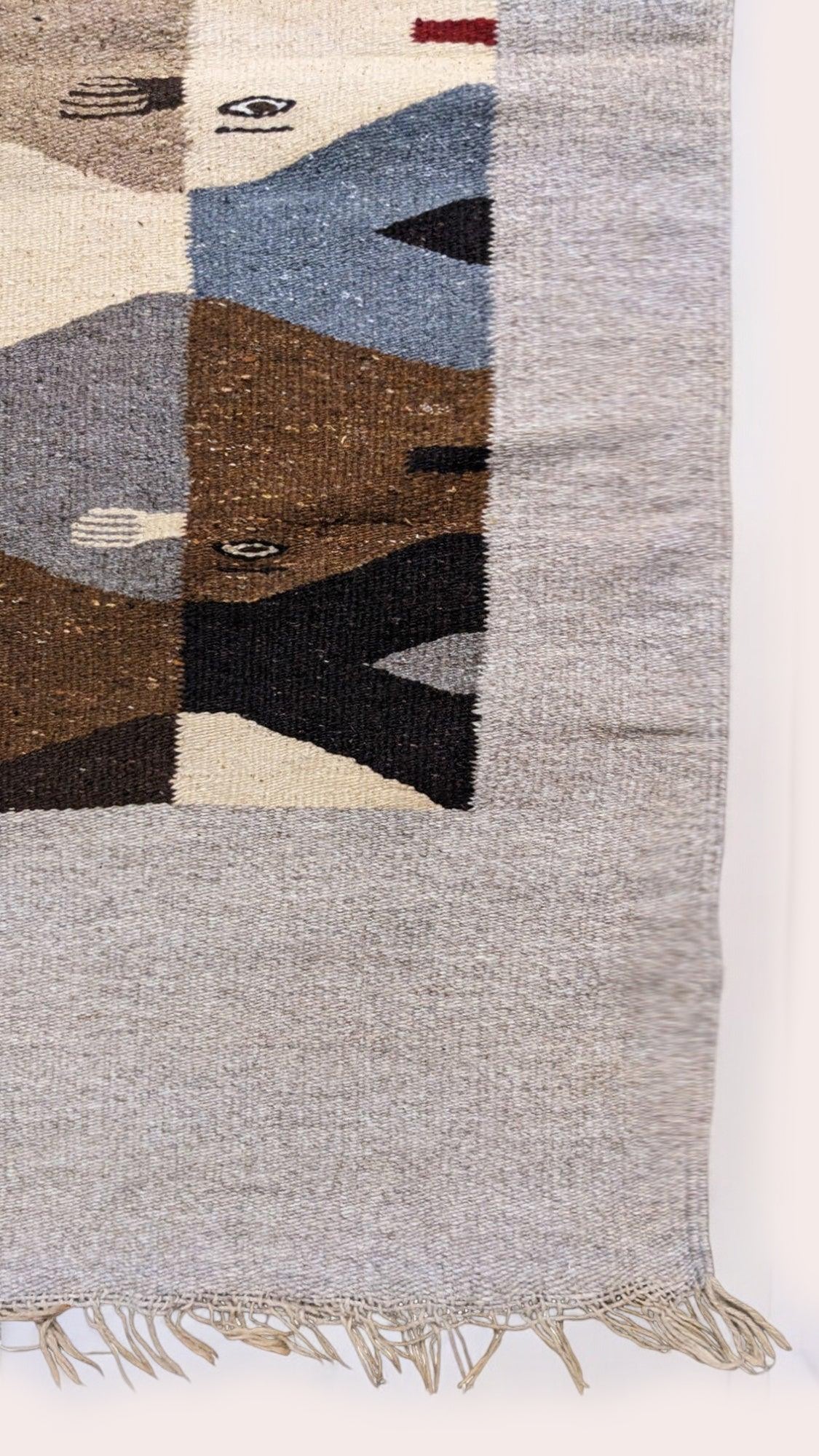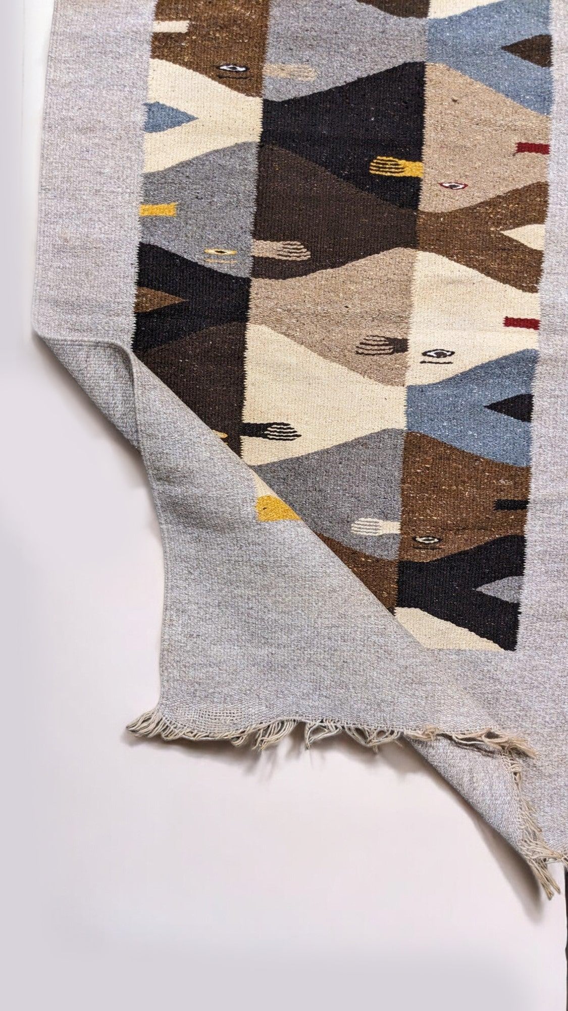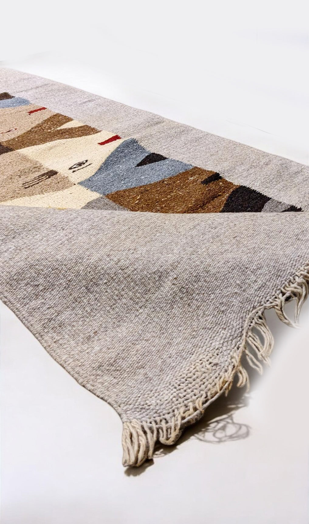 Dieser flachgewebte Teppich besticht durch sein modernes Design mit klassischem Kelim-Muster. Seine handwerkliche Qualität und Langlebigkeit machen ihn zu einer edlen und langlebigen Ergänzung für jeden modernen Raum.