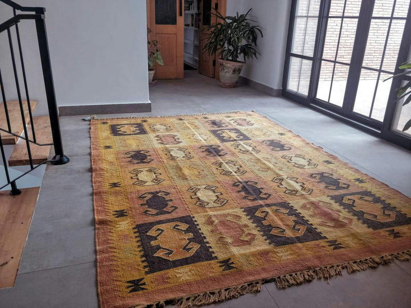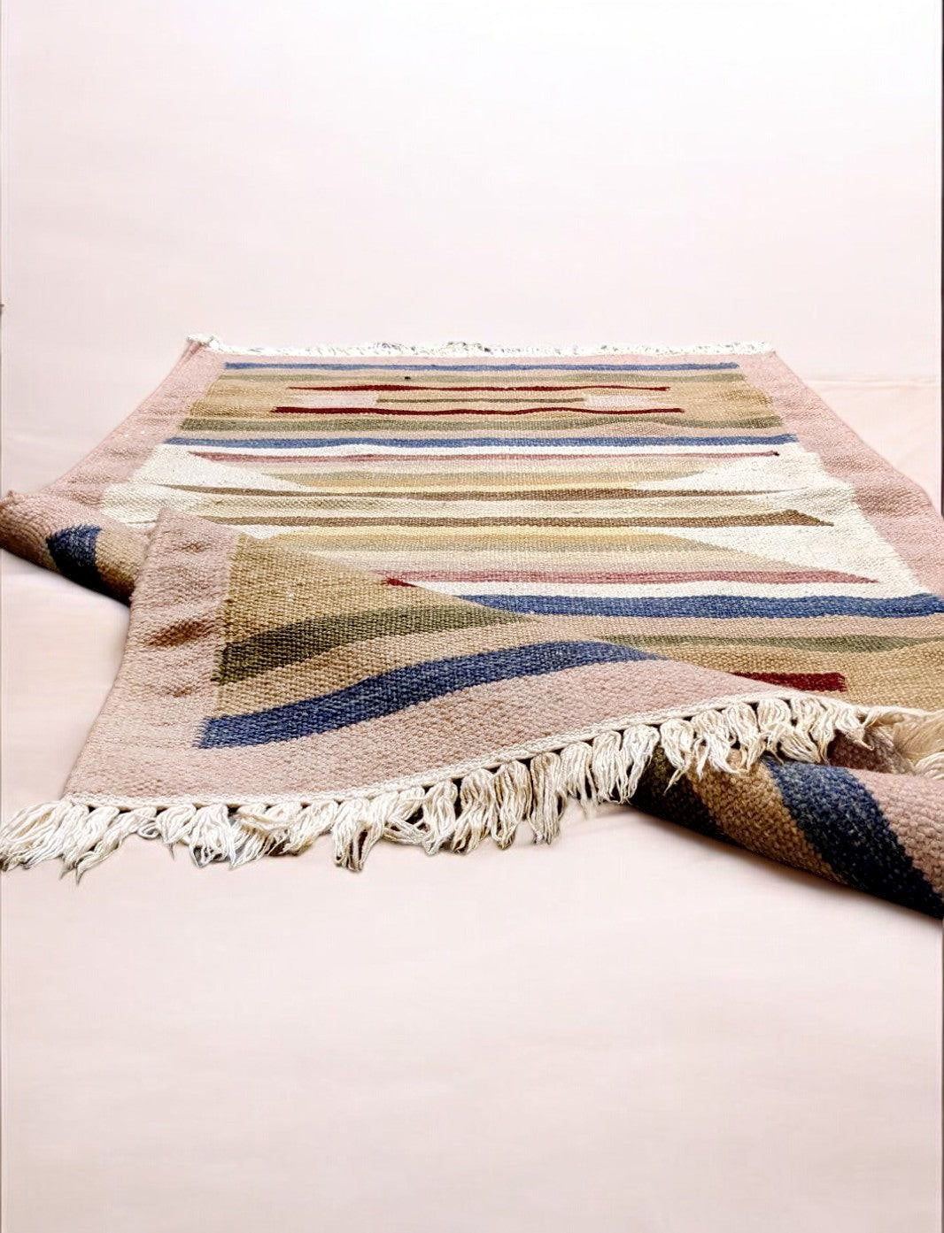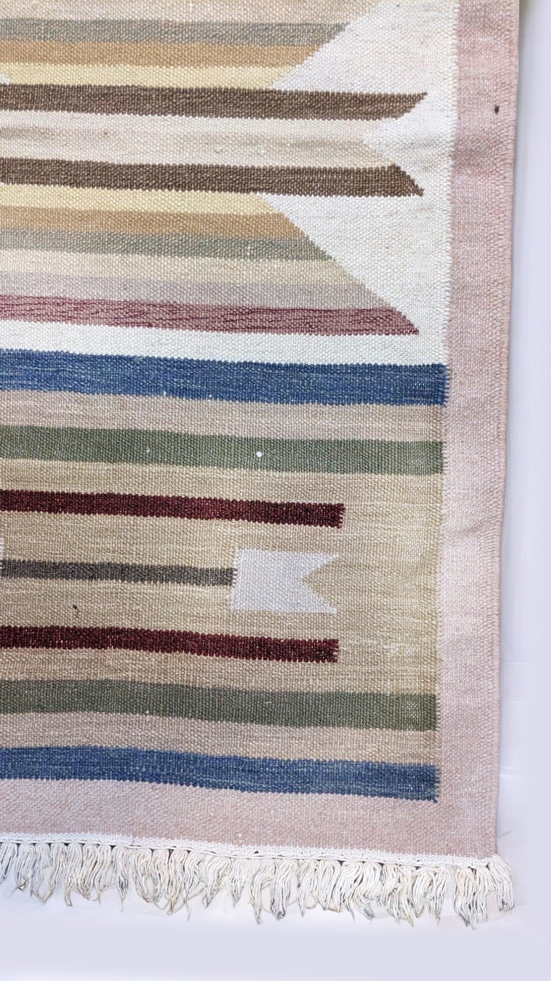 Eine Symphonie aus Farben tanzt über dieses handgewebte Meisterwerk und erfüllt Ihren Raum mit dem reichen Erbe der Türkei. Seine glatte, flachgewebte Textur ist eine harmonische Mischung aus Tradition und moderner Eleganz. Ein lebendiges Statement für die Wohnung des Ästheten.
