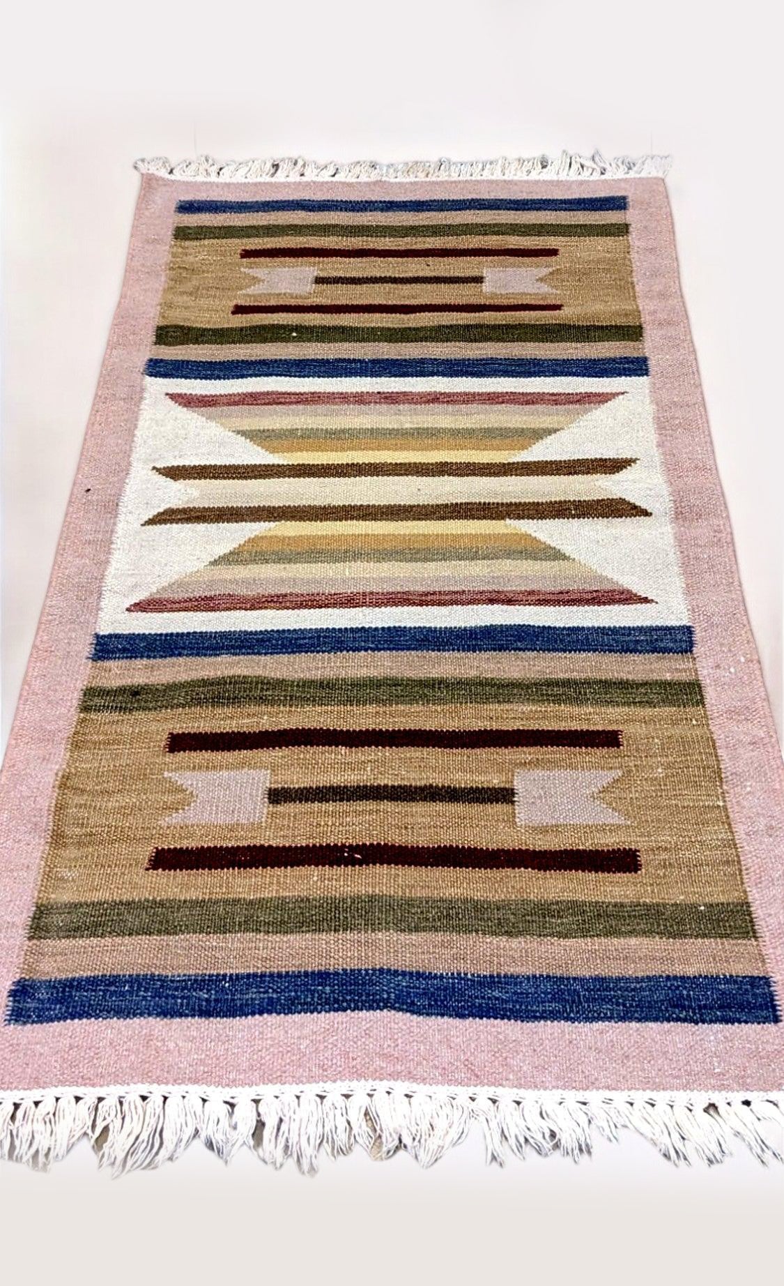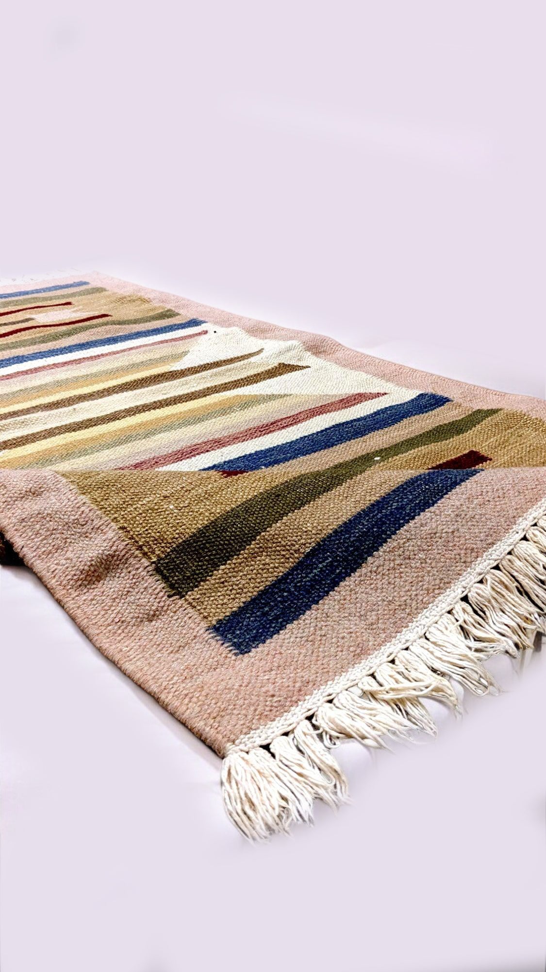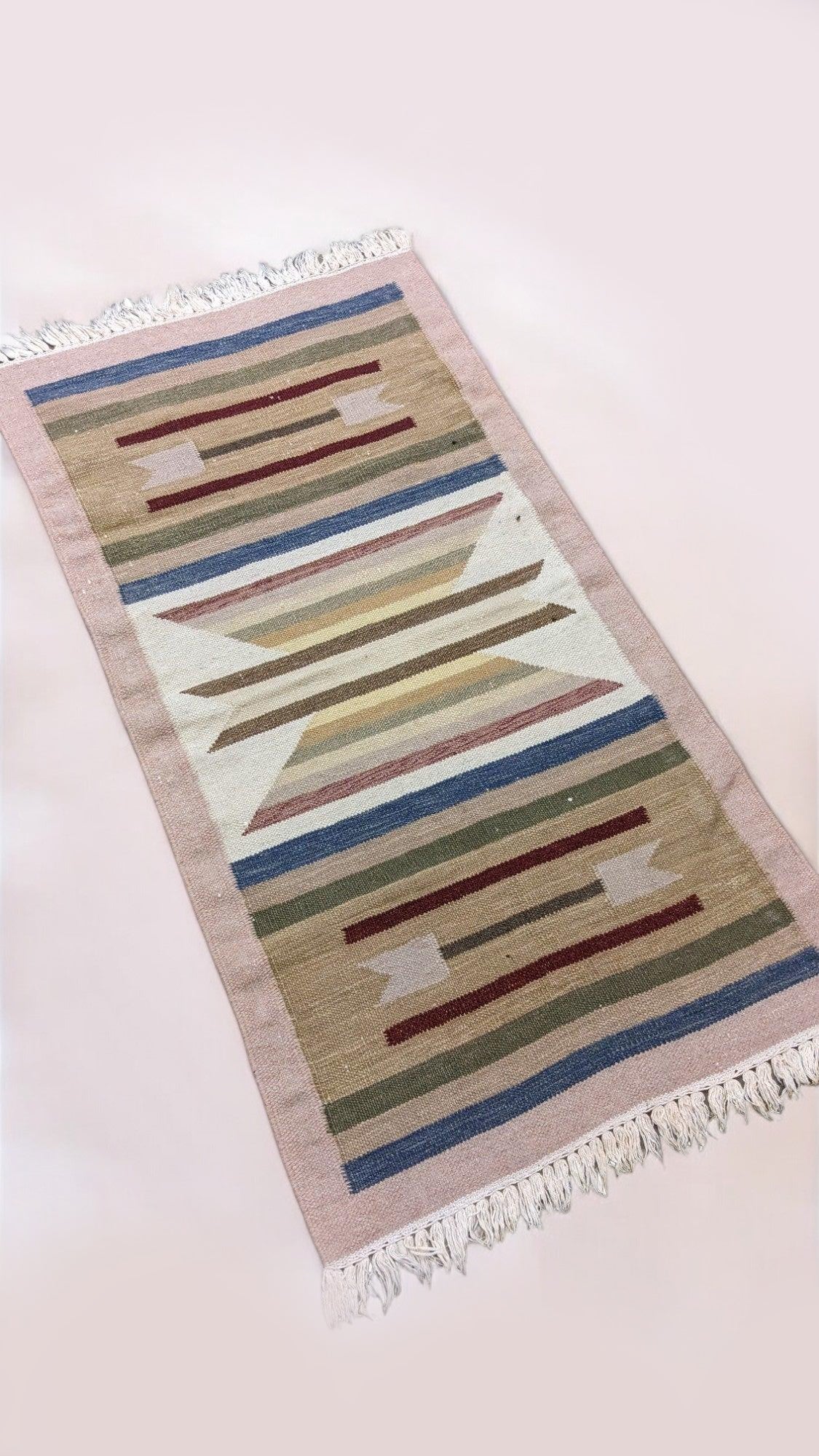 Eine Symphonie aus Farben tanzt über dieses handgewebte Meisterwerk und erfüllt Ihren Raum mit dem reichen Erbe der Türkei. Seine glatte, flachgewebte Textur ist eine harmonische Mischung aus Tradition und moderner Eleganz. Ein lebendiges Statement für die Wohnung des Ästheten.