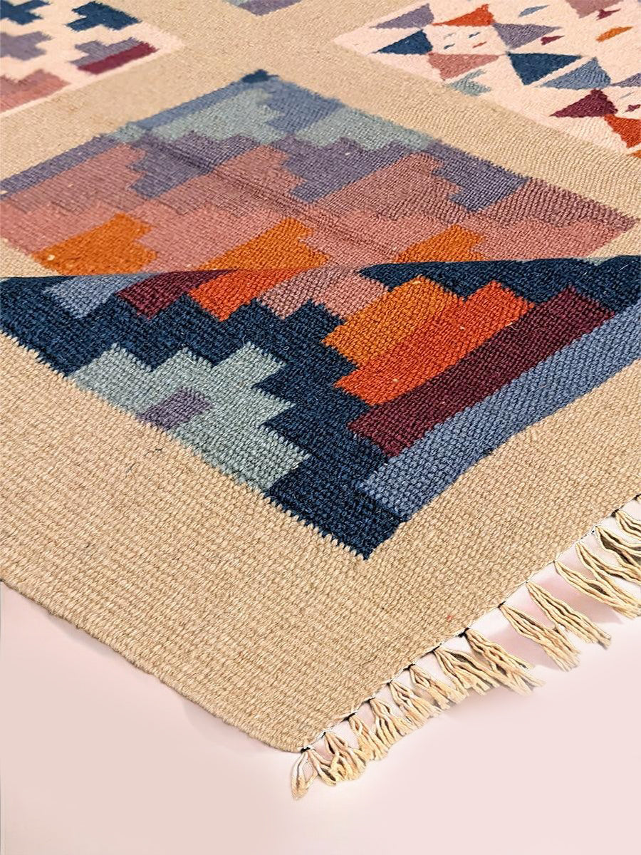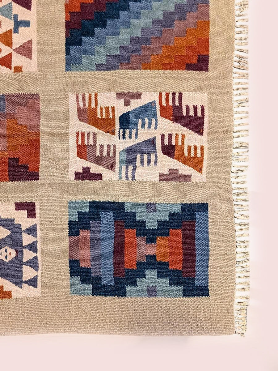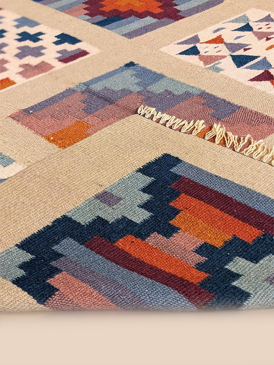 Werten Sie Ihr Zuhause mit der exklusiven Eleganz unseres modernen Flachgewebe-Teppichs auf. Der sorgfältig handgewebte und von Imam Carpet Co. importierte Teppich bringt das reiche künstlerische Erbe der Türkei nahtlos in Ihre Wohnräume. Der aus hochwertiger Wolle gefertigte Flachgewebe-Flor dieses Teppichs sorgt für Langlebigkeit und Komfort und macht ihn zu einer zeitlosen Ergänzung Ihrer Inneneinrichtung. Die faszinierende Kombination aus Kelim-inspirierten Motiven und aufwendigen Patchwork-Mustern, elegant präsentiert in einem beruhigenden Cremeton, verleiht ihm einen Hauch moderner Raffinesse, der jeden Raum mühelos ergänzt. Ob im Wohnzimmer, Schlafzimmer oder Kinderzimmer – dieser moderne Teppich vereint Stil und Vielseitigkeit.