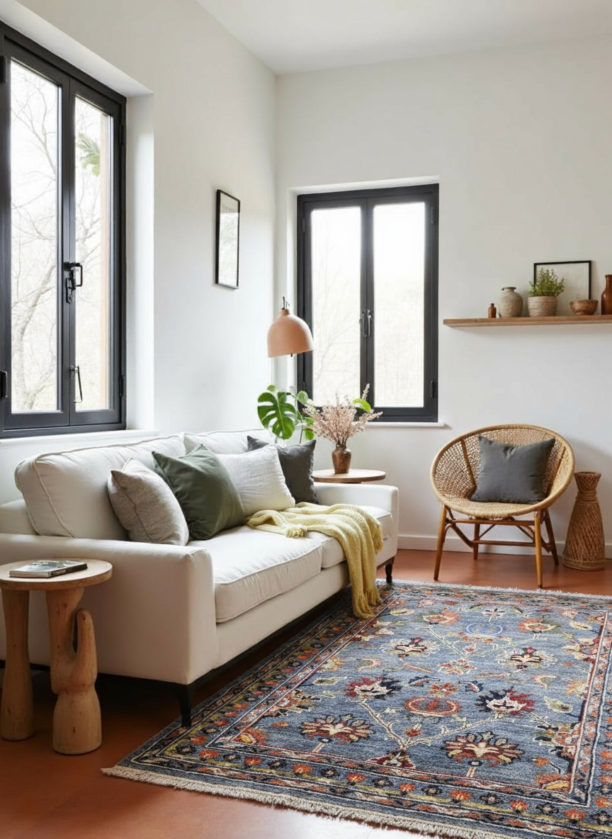 The Cove Rug embodies feminine elegance with hand-knotted, organically dyed wool, gentle blue hues, and floral motifs. Its soft, calming ambience and expert craftsmanship create a sophisticated haven, perfect for making a statement in modern or eclectic spaces.