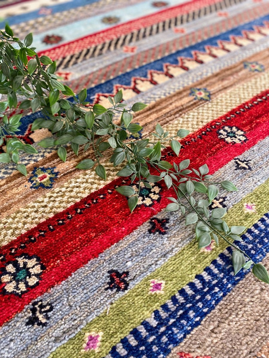 This is a beautiful Khurjeen rug. It is hand-knotted with 100% wool. It is transitional and has a multi colour design. It is a great addition to any home. The traditional weaving techniques create a soft yet durable finish, as the wool fibres interlock to create a sturdy and resilient rug that will stand the test of time.