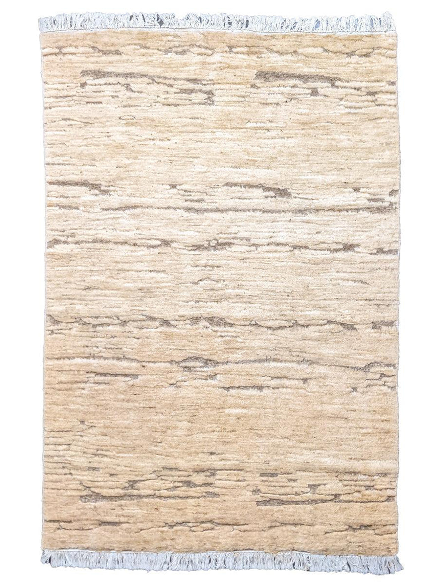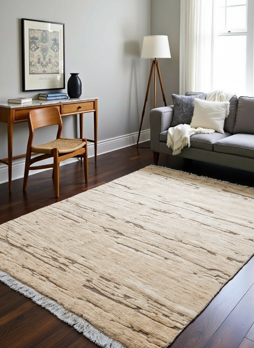 Le tapis Casablanca, noué main, présente un aspect durable et naturel grâce à son motif texturé et ses stries horizontales. La neutralité et la polyvalence de ses teintes beiges à crème lui permettent de s'intégrer facilement à divers styles de décoration intérieure. Son style contemporain et chaleureux allie douceur et discrétion visuelle, idéal pour un intérieur confortable.