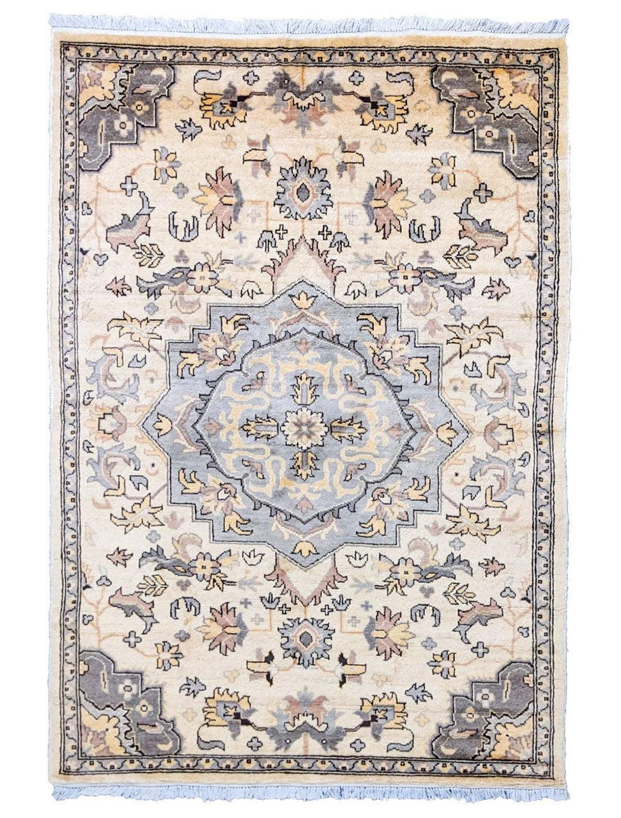 Ce tapis classique présente un fond beige doux orné de motifs floraux et géométriques complexes aux tons gris clair et jaune chaud. Le médaillon central symbolise la protection et la stabilité, tandis que la palette de couleurs douces apporte de la chaleur à tout espace. Noué à la main avec soin en pure laine teinte naturellement, il allie élégance et savoir-faire traditionnel pour un charme intemporel.