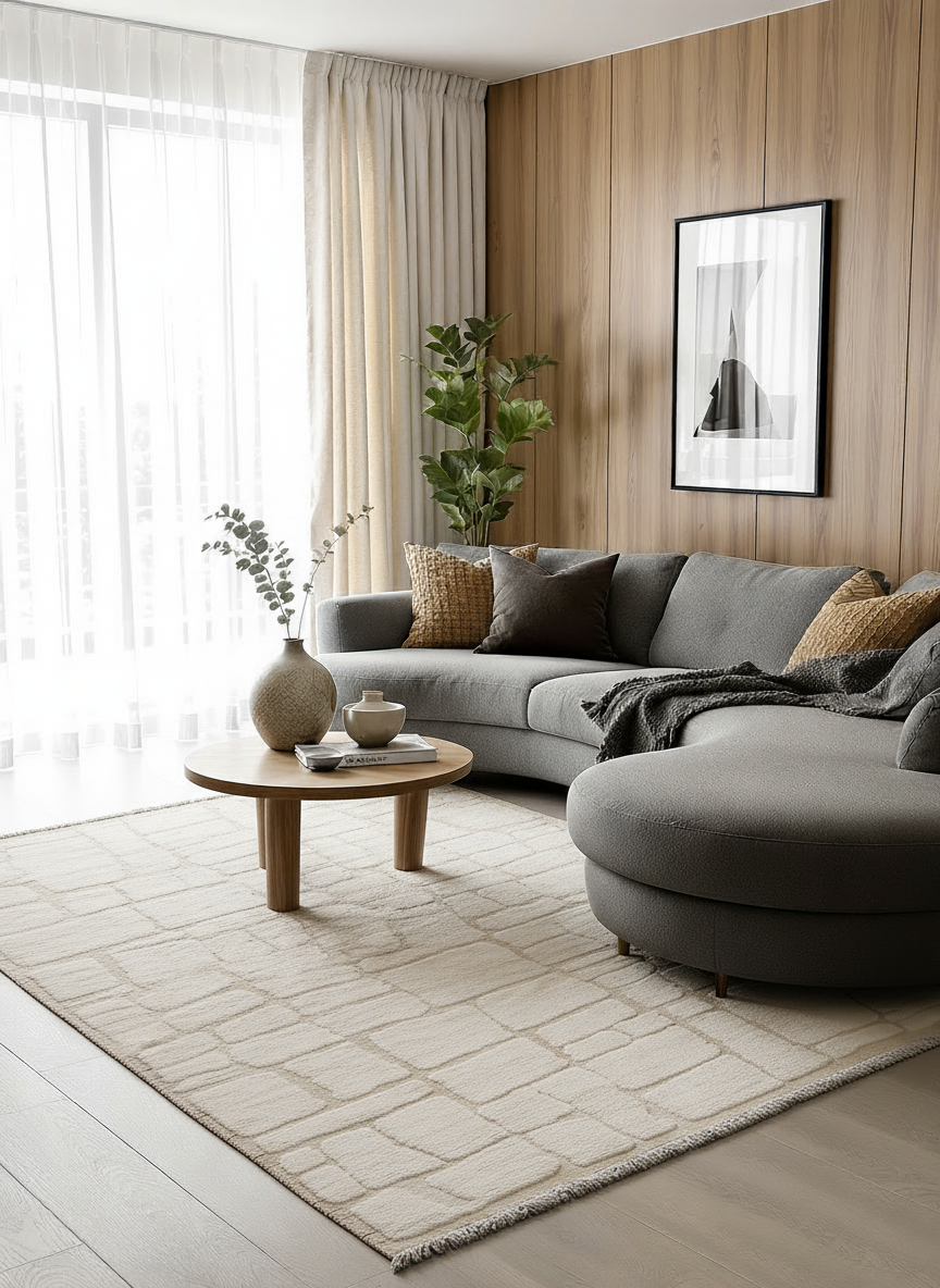 Fabriqué avec soin et au design unique, le tapis Modishic de style nordique abstrait arbore un splendide motif pavé texturé, un motif géométrique simple composé de rectangles de différentes tailles disposés en grille décalée et une palette de couleurs neutres rehaussée de franges. Chaque pièce est soigneusement nouée et sculptée à la main dans une laine non teinte de première qualité, ce qui la rend à la fois durable et écologique.