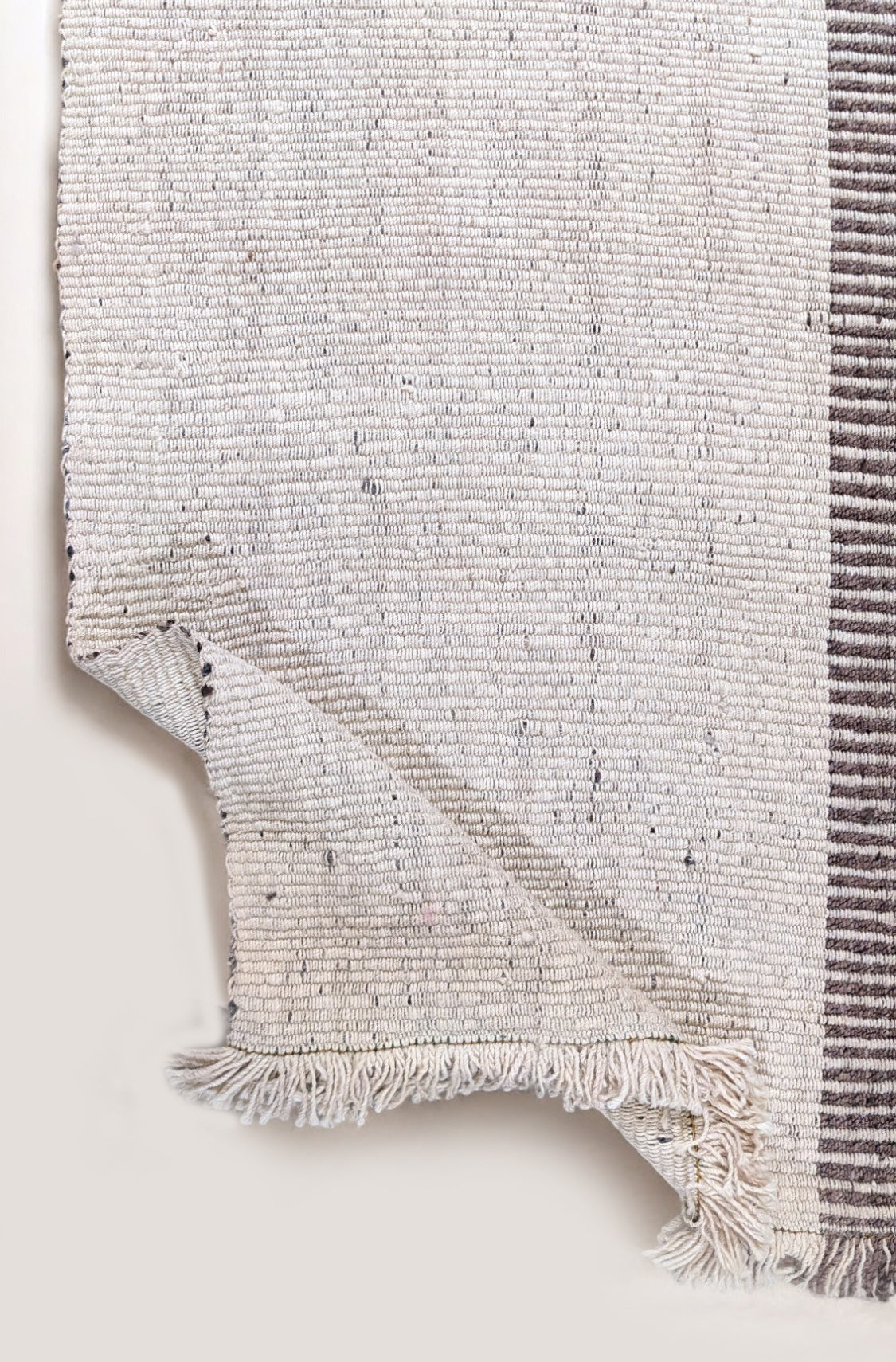 Ce tapis marocain Meknès, noué à la main en laine de haute qualité, arbore une couleur marron moderne avec un motif géométrique en losanges blanc cassé. La chaleur du marron est parfaitement équilibrée par la clarté du blanc, créant un contraste apaisant, idéal pour les chambres ou les salles de méditation. Son motif symétrique crée une atmosphère apaisante, invitant à la détente et à la sérénité.