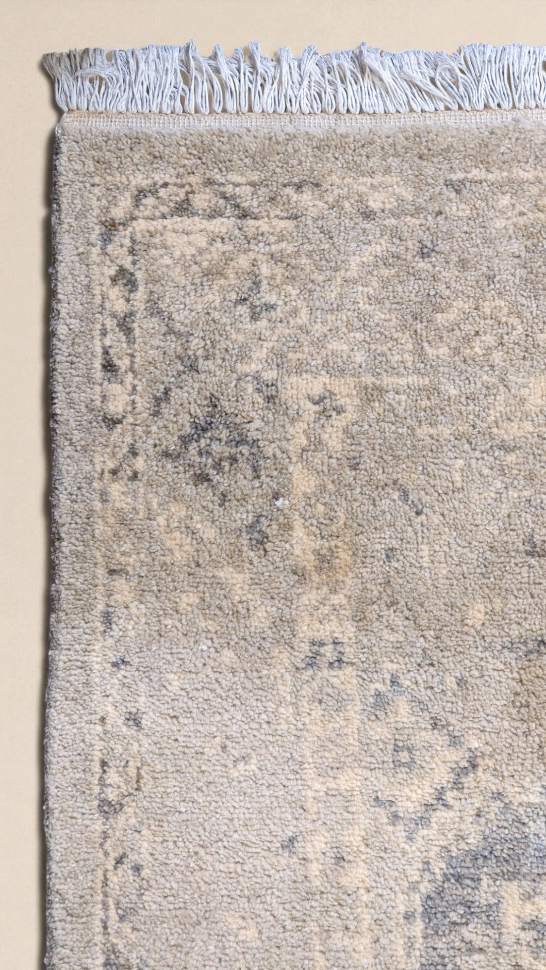 Hand-knotted by skilled artisans, the Aura rug brings a sense of calm sophistication to any room. Crafted from undyed, hand-spun New Zealand wool, its natural variations create a unique, textural landscape. The subtle, distressed oriental design seems to emerge and recede, giving the rug a dynamic, almost ethereal quality.