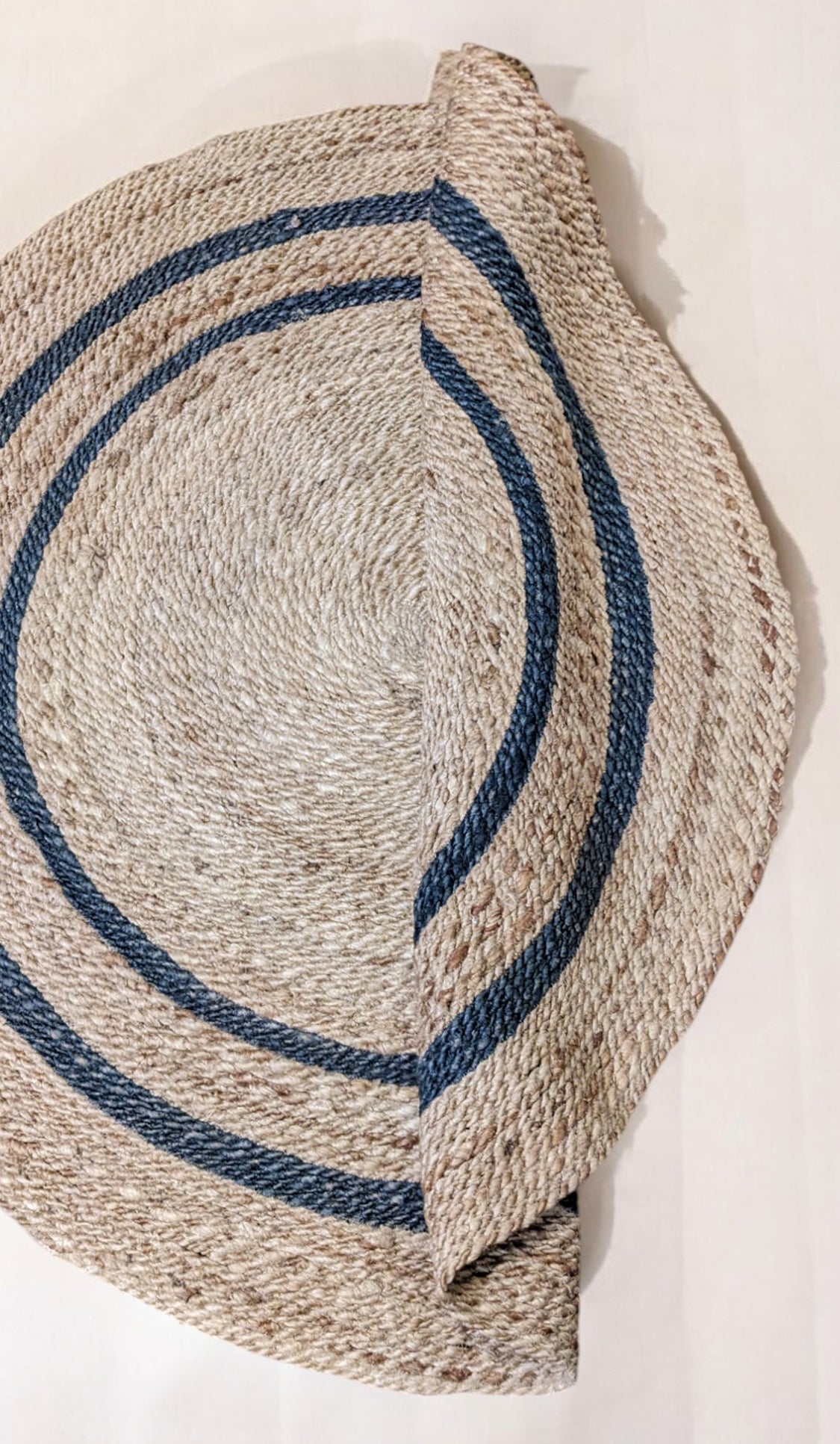 Who said rugs have to be square only? our handwoven beauty from Turkey brings a fresh, organic vibe to any space. Made from 100% natural jute, its spiral weave and bold navy accents give it just the right amount of personality—simple, stylish, and oh-so-versatile.