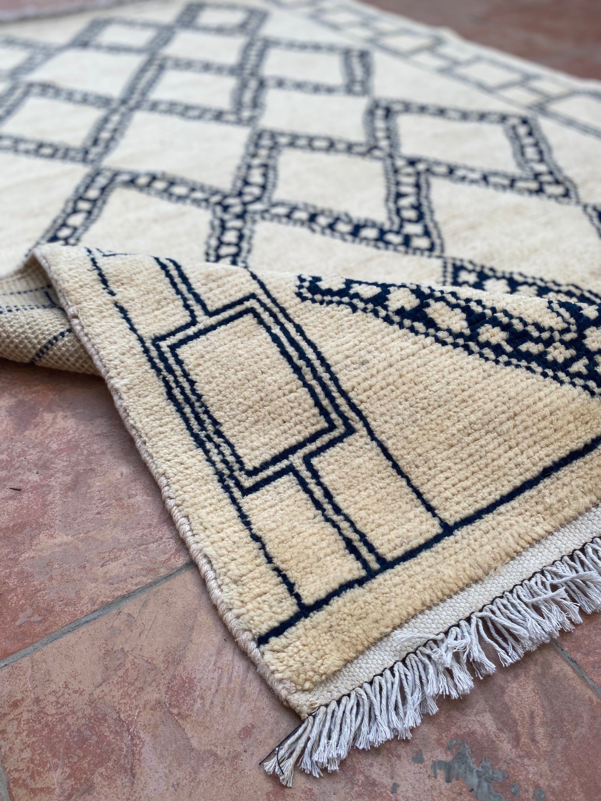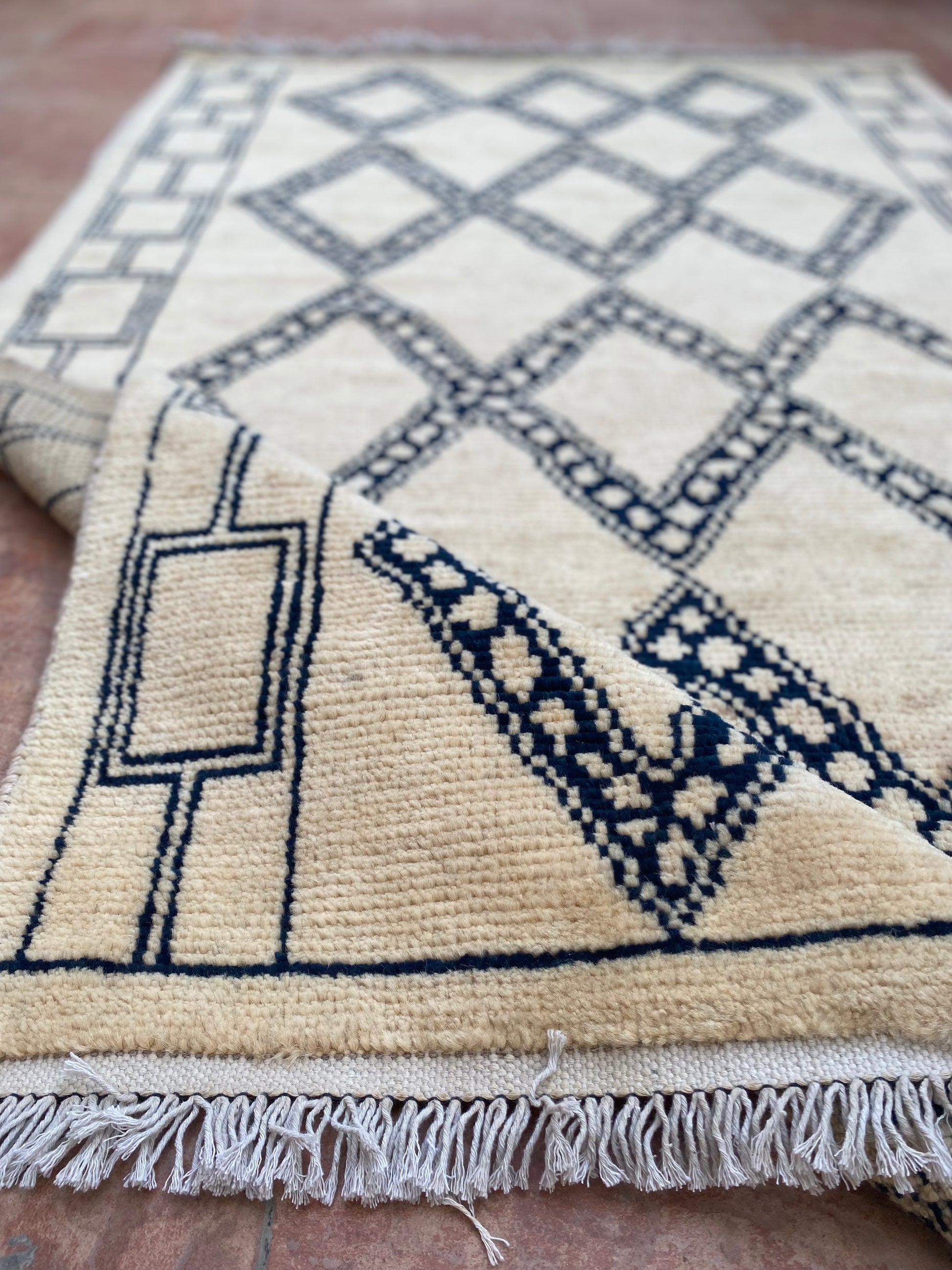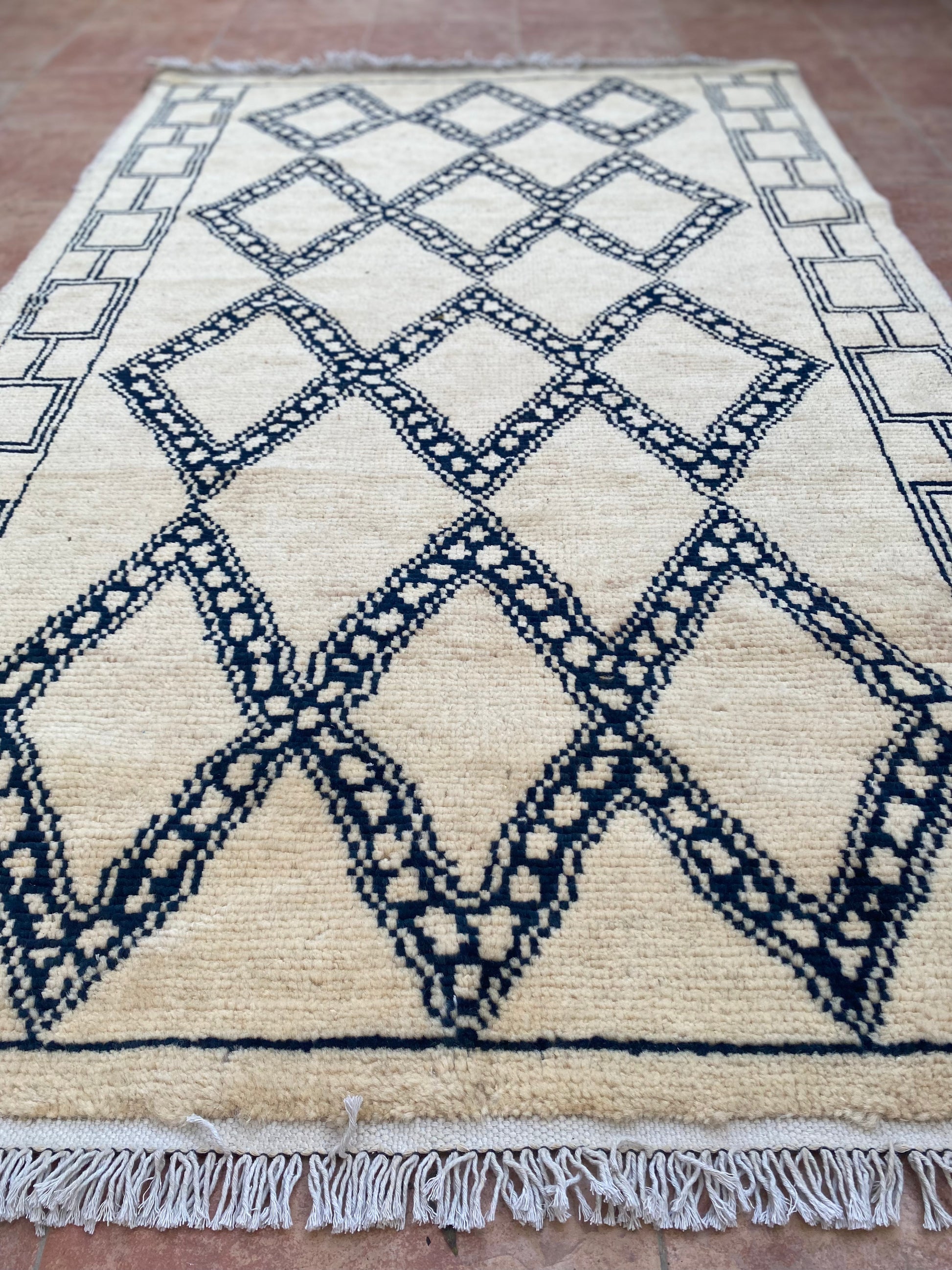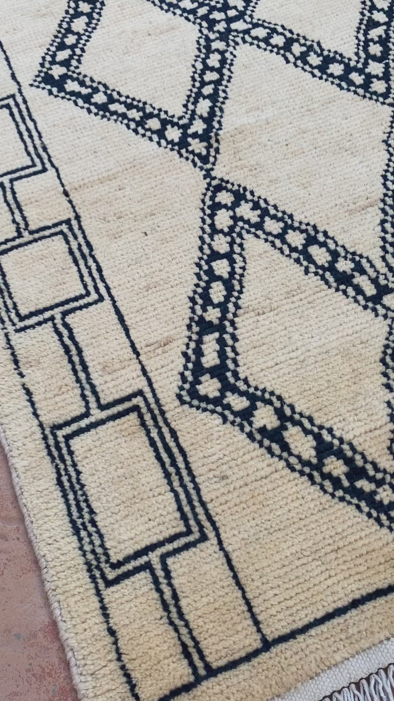 This hand-knotted wool Moroccan rug combines timeless Mid-Century Modern style with an understated design. Its diamond patterns create a rhomb trellis that crisscrosses organically, creating a visually arresting depth that will mesmerize any viewer.