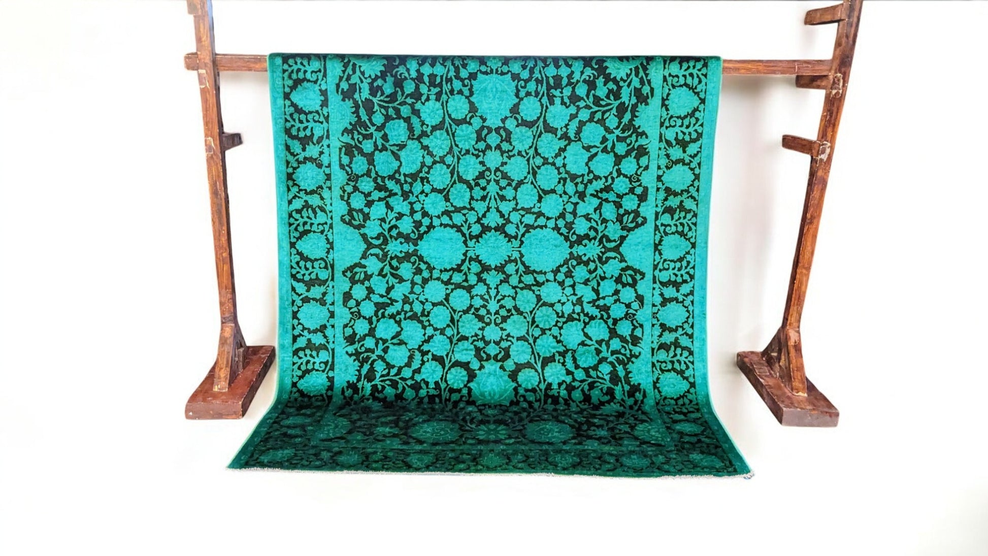 Kaiwhe is where bold meets beautiful. Its deep green backdrop bursts with oversized teal Ziegler-style florals, creating vivid contrast and eye-catching appeal. Hand-knotted in Pakistan with a silk wash embossed finish, this plush wool rug brings texture, depth, and timeless design together. A defined border frames the piece, grounding its boldness with tradition. It’s luxury made to turn heads.