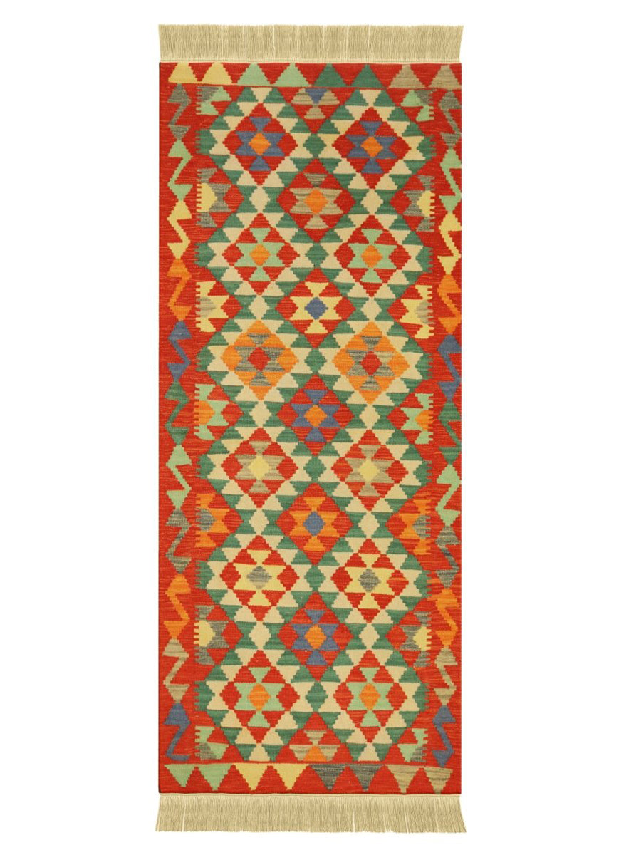 Maimana Kilims are traditional flatwoven rugs from Afghanistan, handcrafted using durable Ghazni wool and featuring bold geometric tribal motifs. Each piece is one of a kind and made only once.