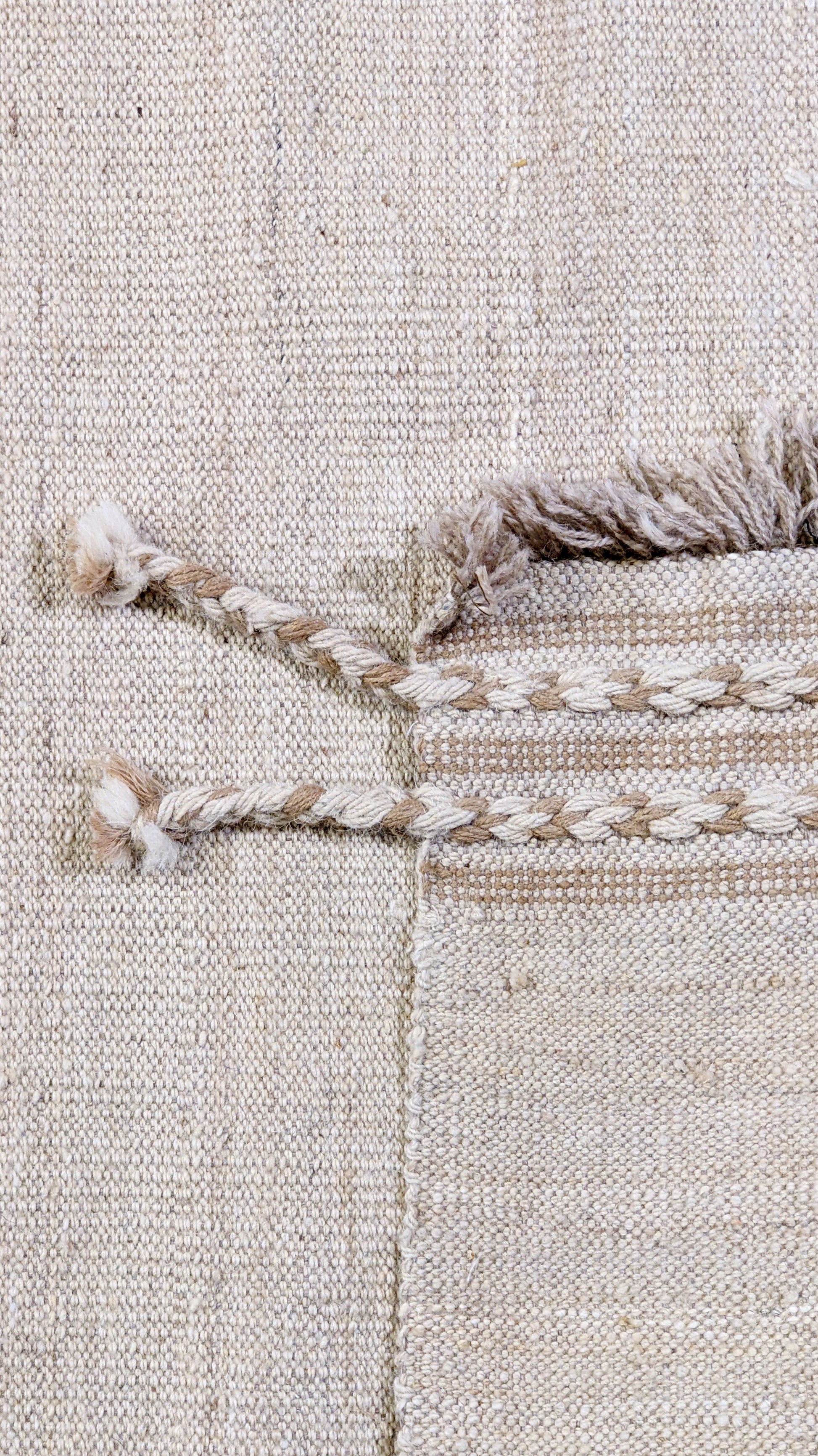 Imaco Rug's Arden flatweave wool rug is the epitome of understated elegance, with its solid white or light beige color and subtly textured woven surface. The fine horizontal lines create a gentle rhythm, while the braided border in a slightly darker beige adds a refined touch. Finished with short knotted fringes and delicate tassels at each corner, this handmade area rug brings Scandinavian-inspired minimalism into any room, offering a serene, timeless aesthetic.