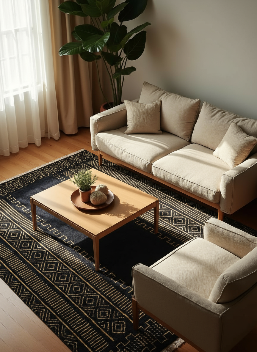 The Raven Rug is a bold rug that invites you to engage in beauty rather than just adding a dash of richness to modern or eclectic rooms. Golden Indo-Tribal geometric designs set against a dark backdrop lend richness and elegance to your room, creating a sophisticated yet inviting atmosphere that appeals to all visitors.