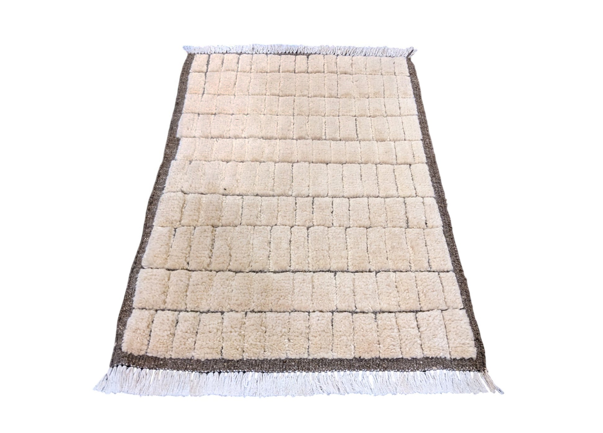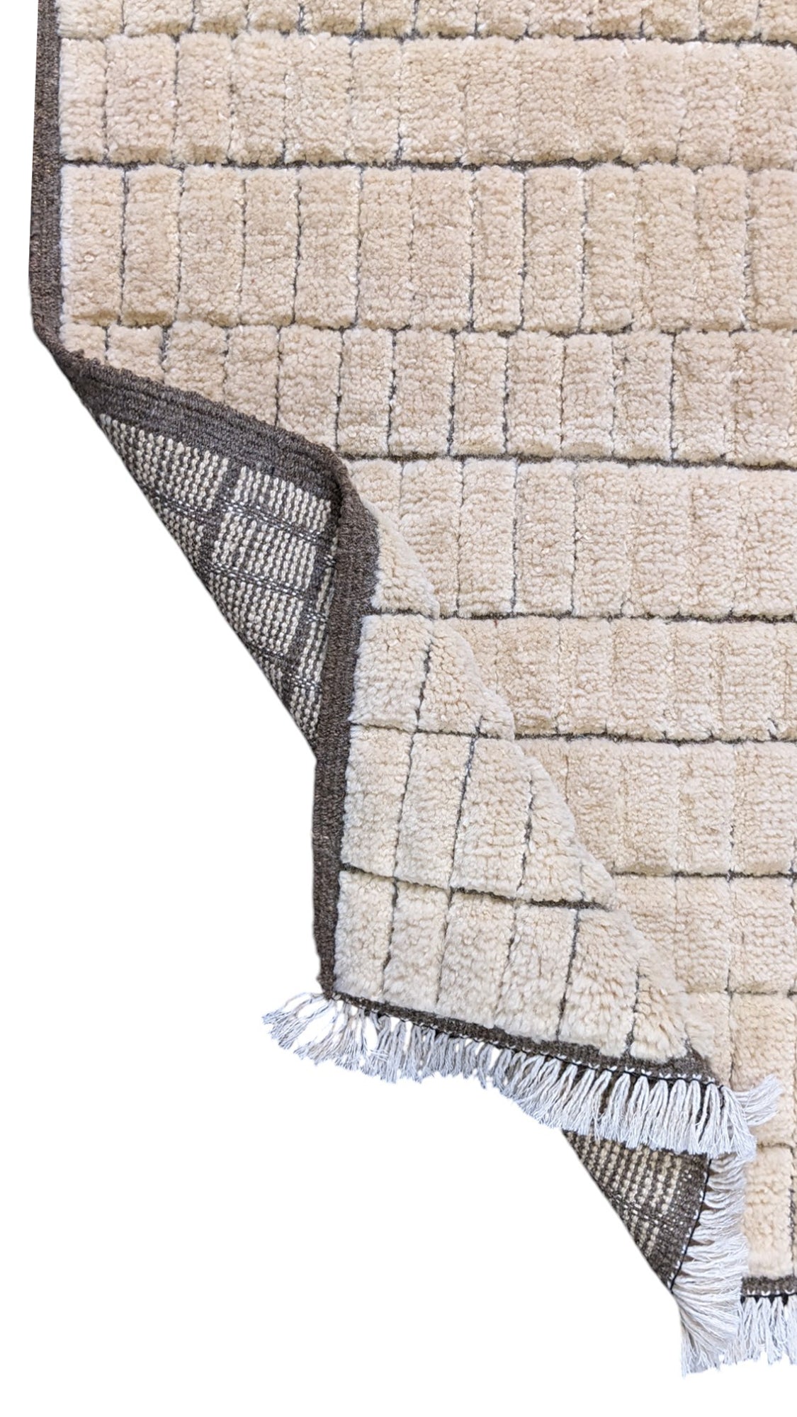 This Meknes Moroccan Rug is hand-knotted from high-quality wool and features a modern brown colour with an off-white diamond-shaped geometric pattern. The warmth of brown is perfectly balanced by the clarity of white, generating a calming contrast that is perfect for bedrooms or meditation rooms. Its symmetrical pattern creates a soothing atmosphere, inviting relaxation and serenity.