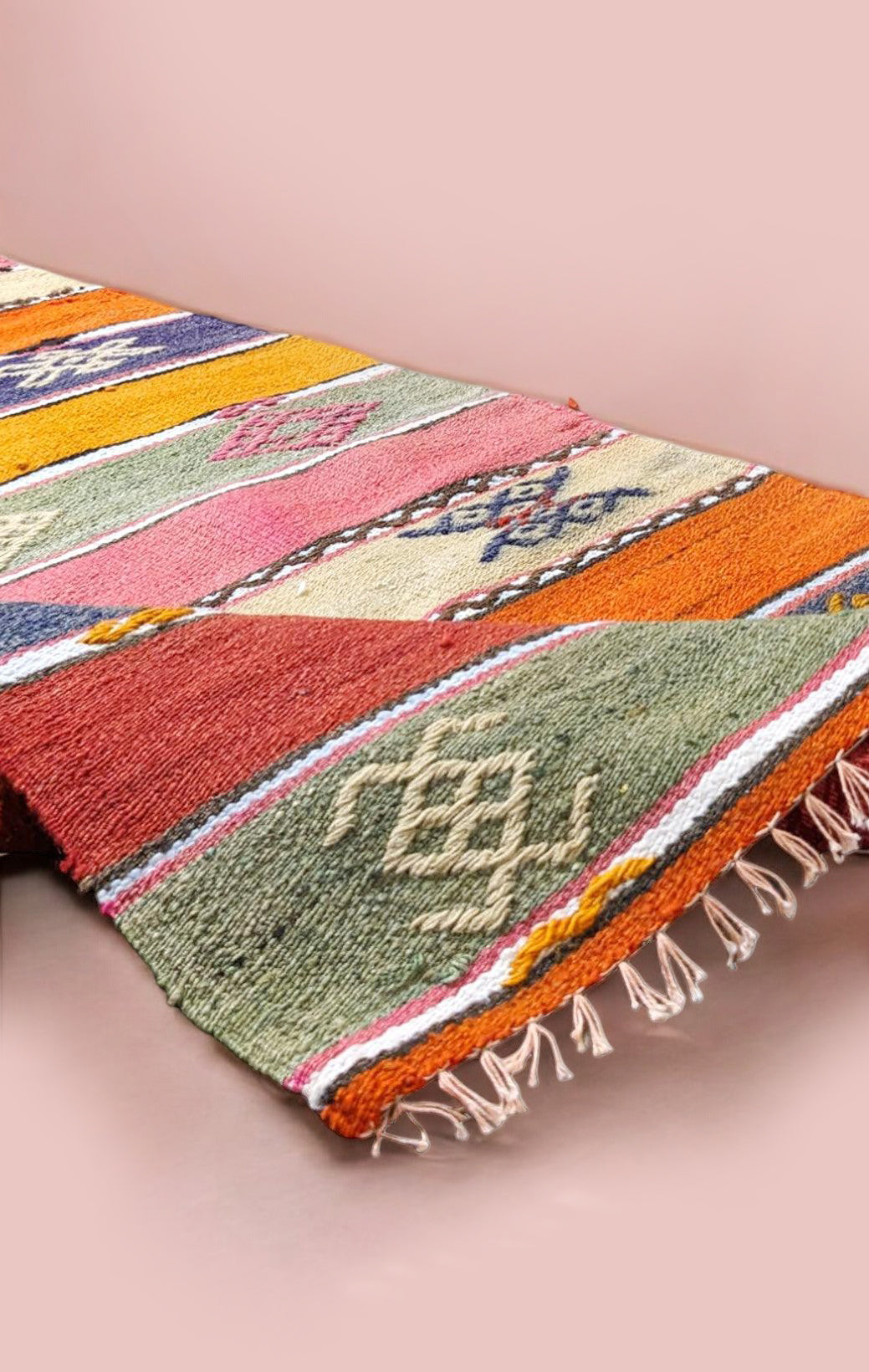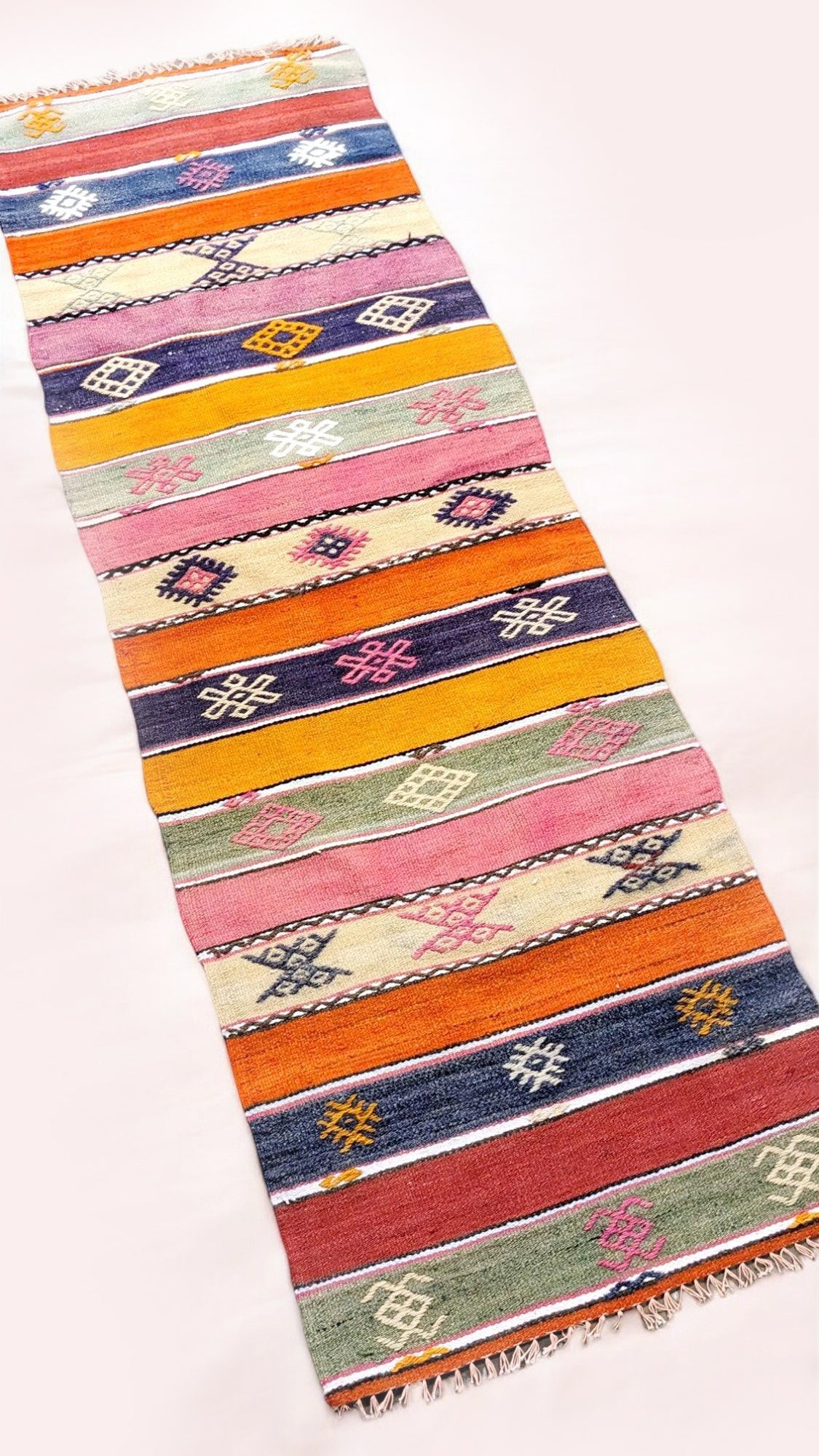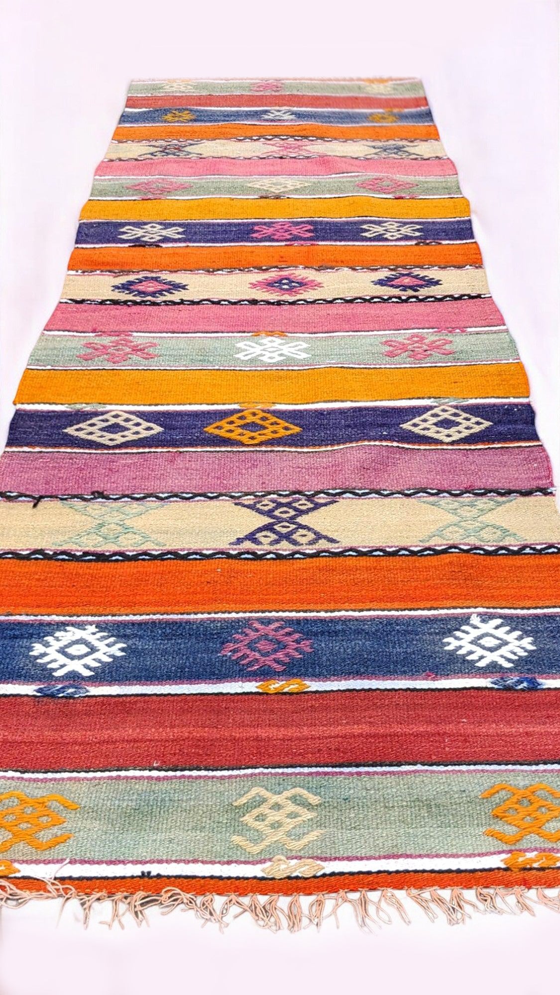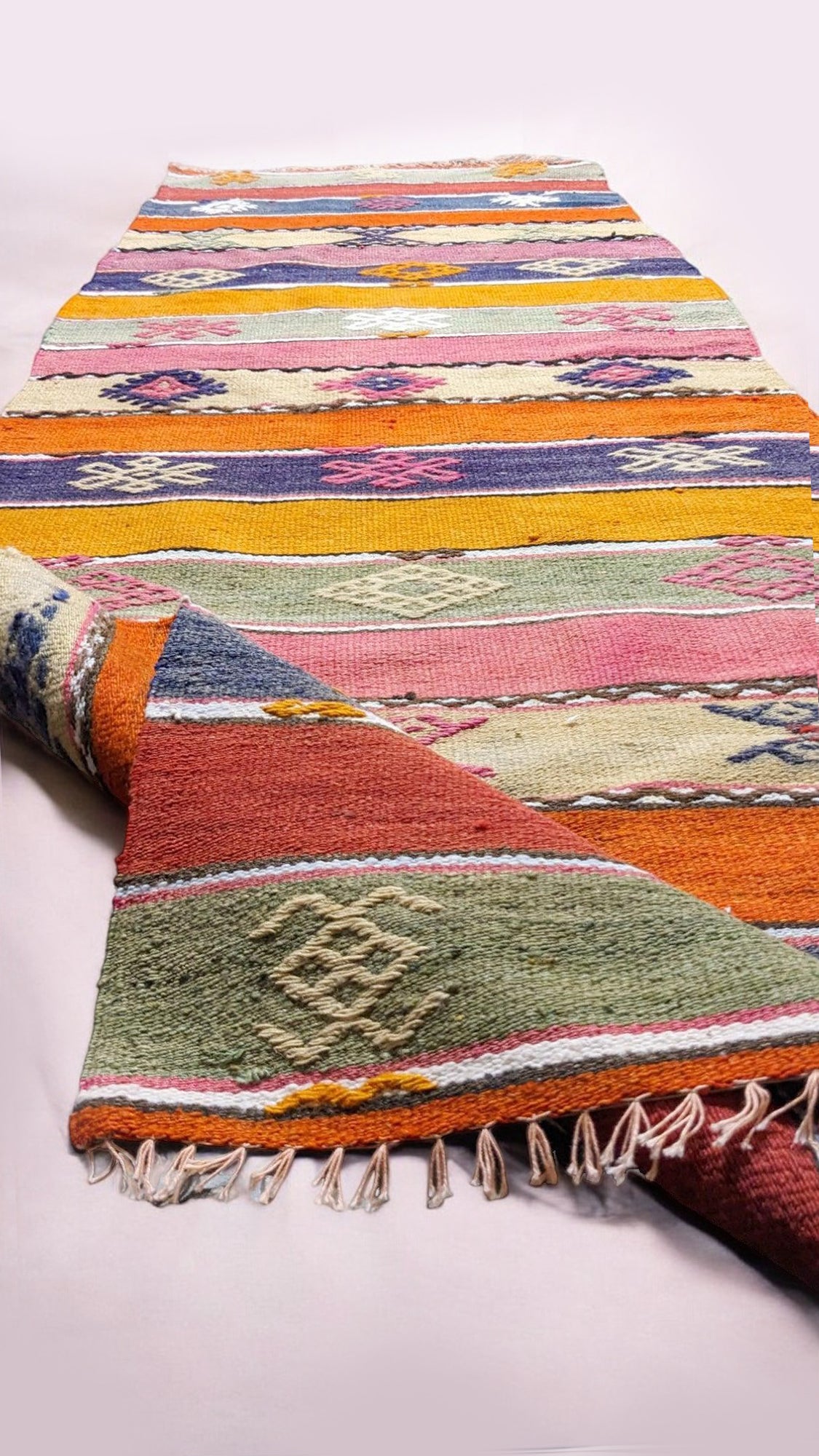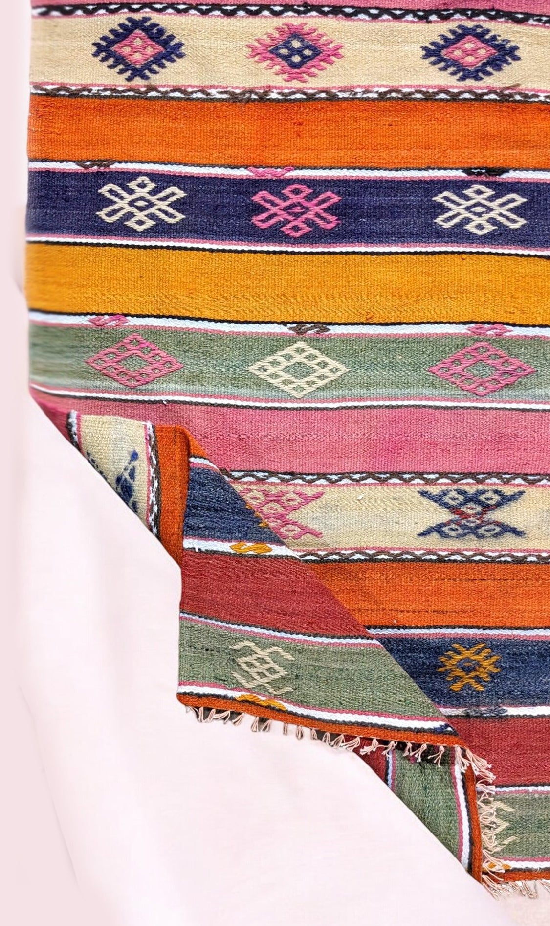 Our Modern Turkish Kilim Wool Rug. Handwoven in Turkey from high-quality wool, this rug blends contemporary design with classic Kilim motifs. Its vibrant multicolor palette and artisanal quality make it a stunning and durable piece.